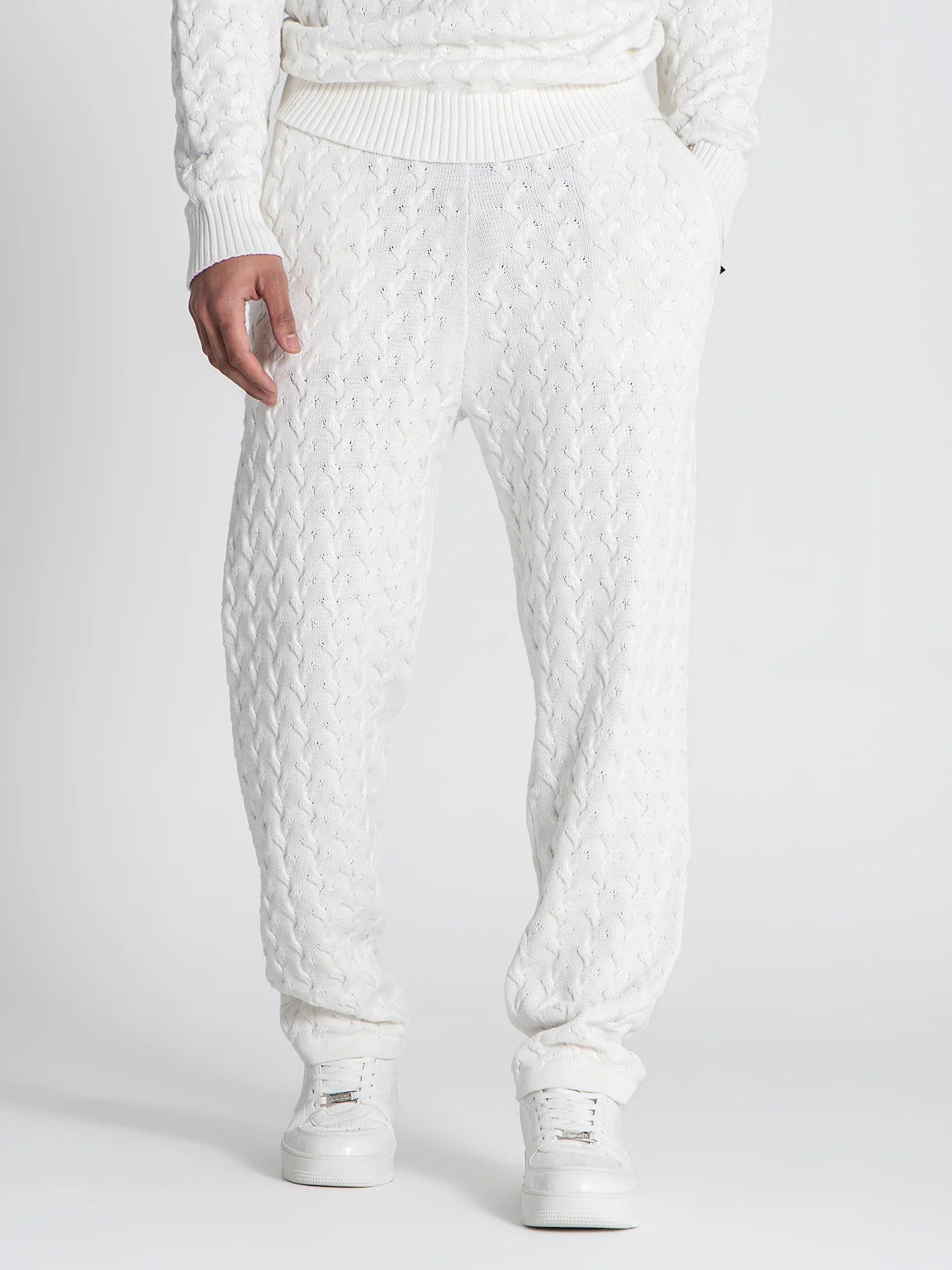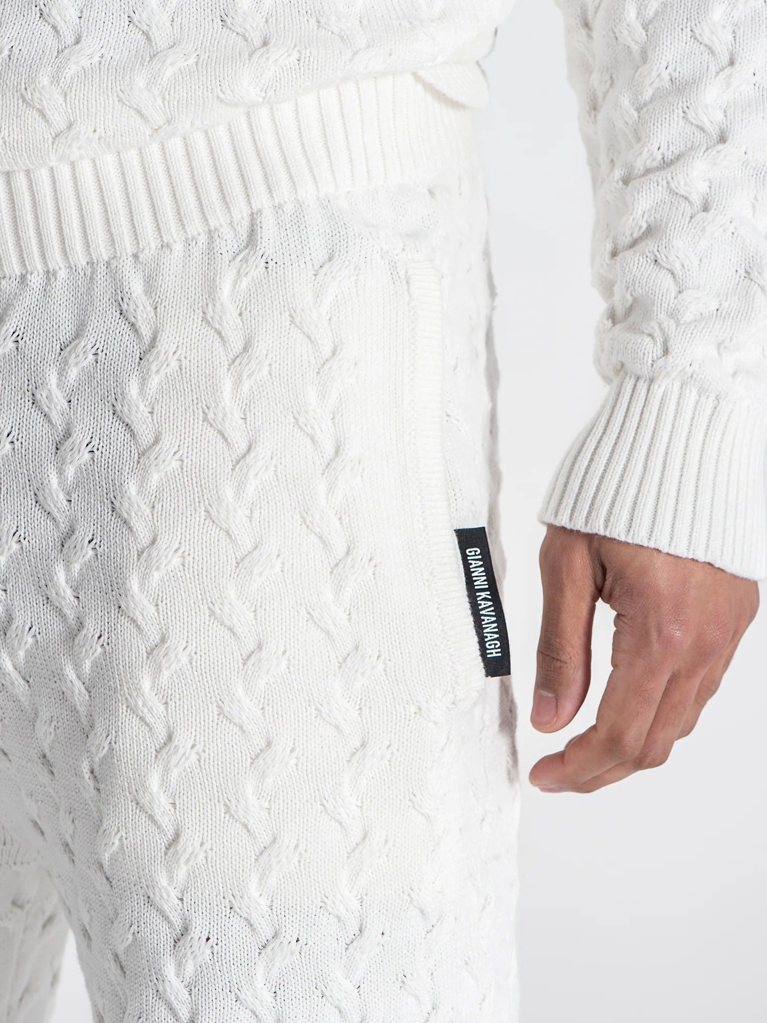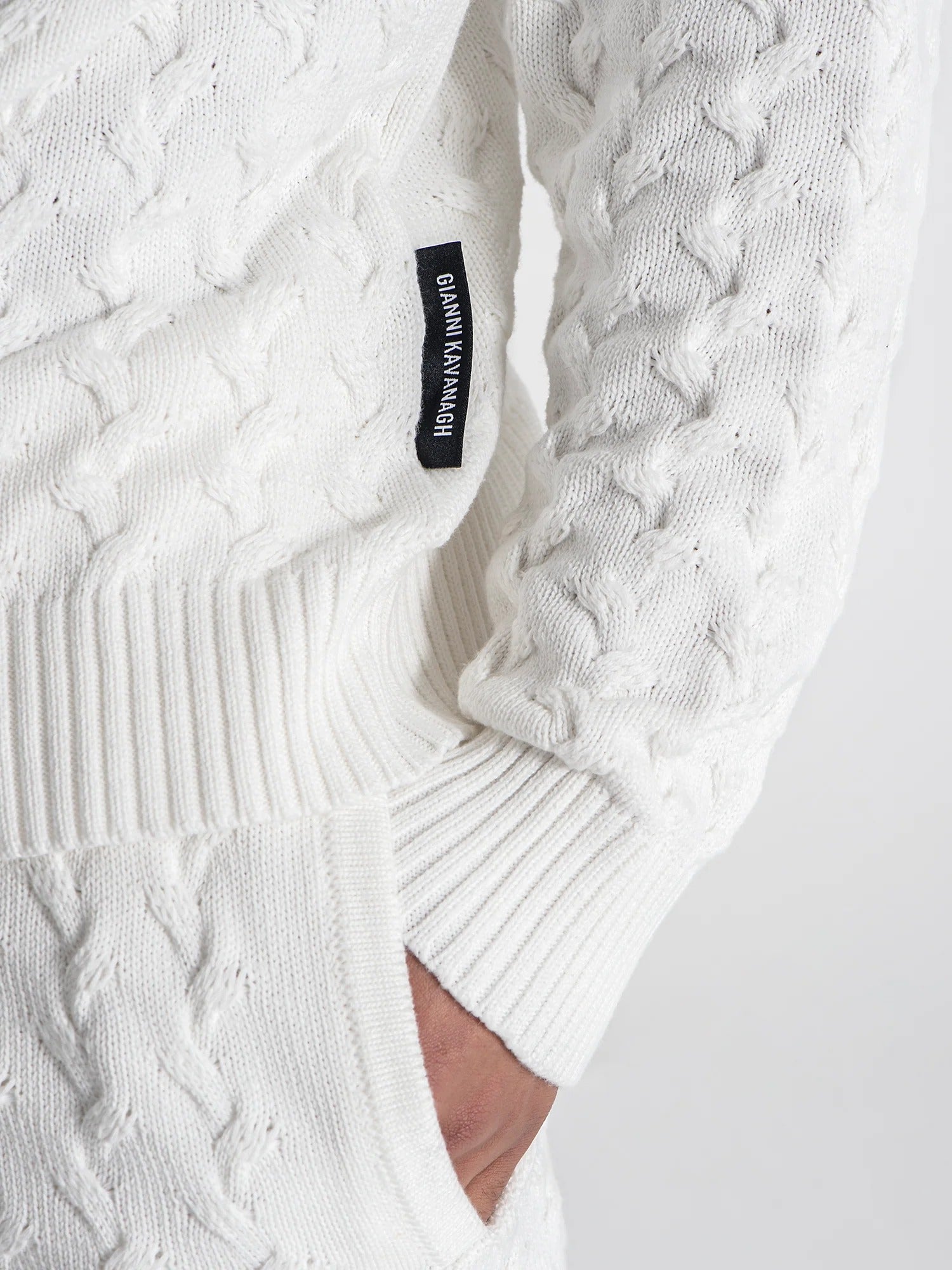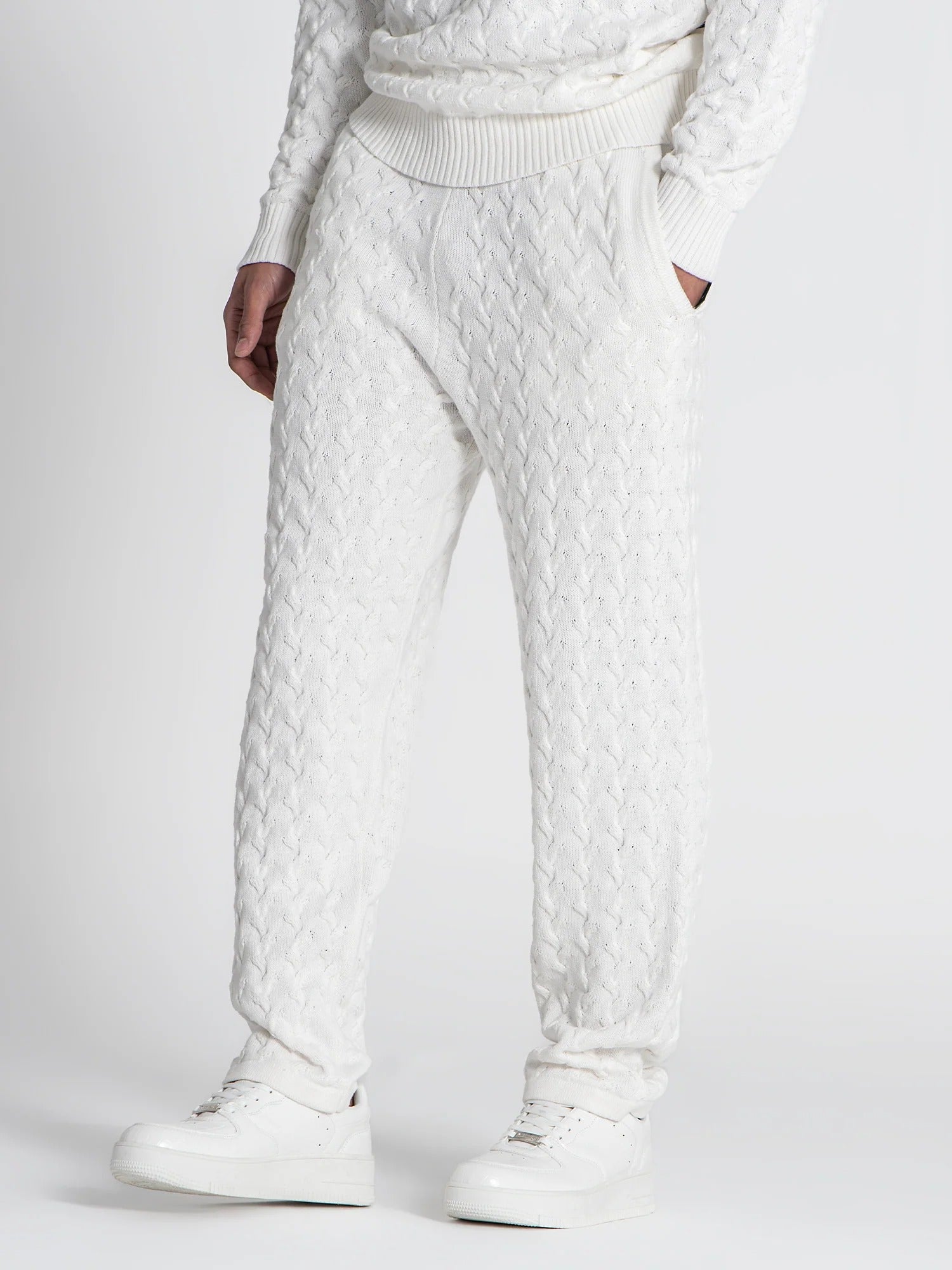 Este conjunto White Snug Knit, composto por sweatshirt e calças coordenadas, combina conforto e estilo de forma prática. Confeccionado em 100% algodão, oferece um toque suave que respira bem, ideal para uso diário. A malha tricotada, com ribanas definidas, cria uma textura aconchegante e moderna.