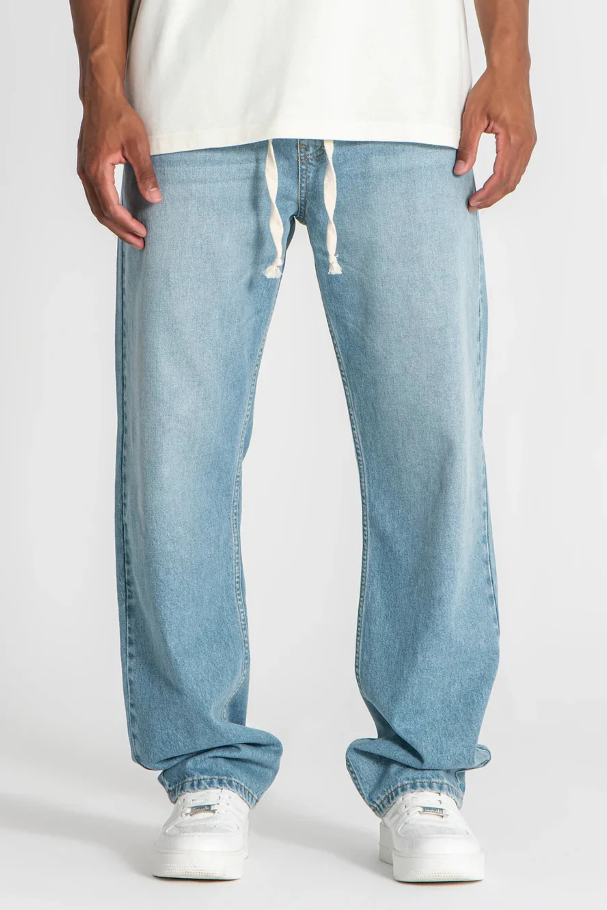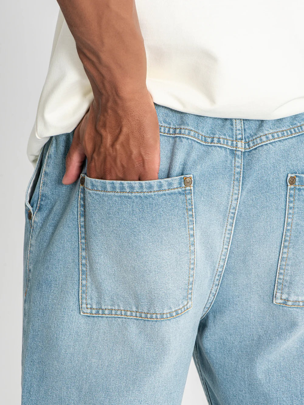 Estas calças combinam estilo descontraído e conforto autêntico. Feitas em 100% algodão, são leves mas robustas, perfeitas para uso diário. O corte relaxed fit (solto) e a perna reta garantem mobilidade e caimento natural. A lavagem azul clara transmite um ar casual moderno e versátil, ideal para múltiplas combinações.