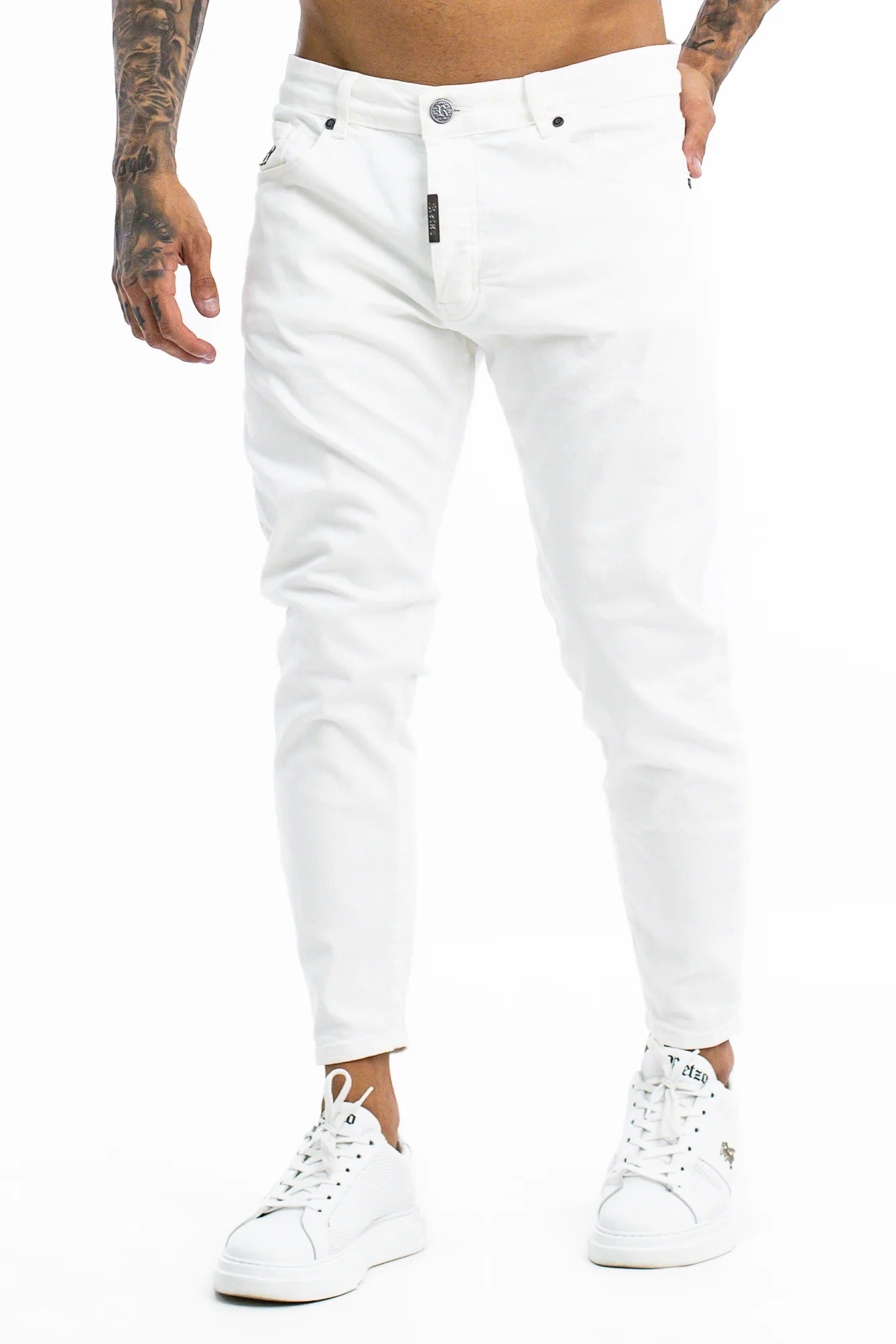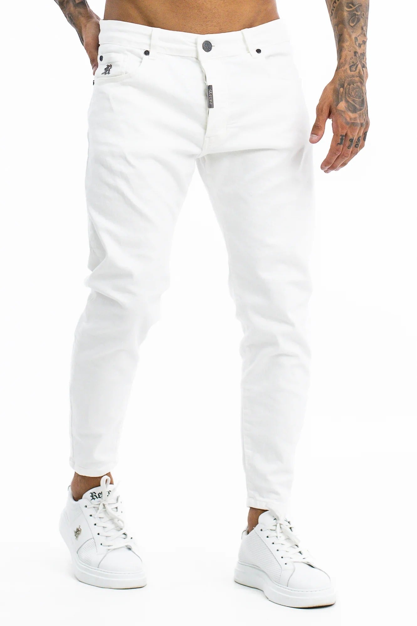 Jeans em branco com um estilo contemporâneo, ideal para quem procura uma peça simples mas versátil para looks casuais. Confecionado em Portugal, esta calça de ganga é uma adição moderna a qualquer guarda-roupa masculino.