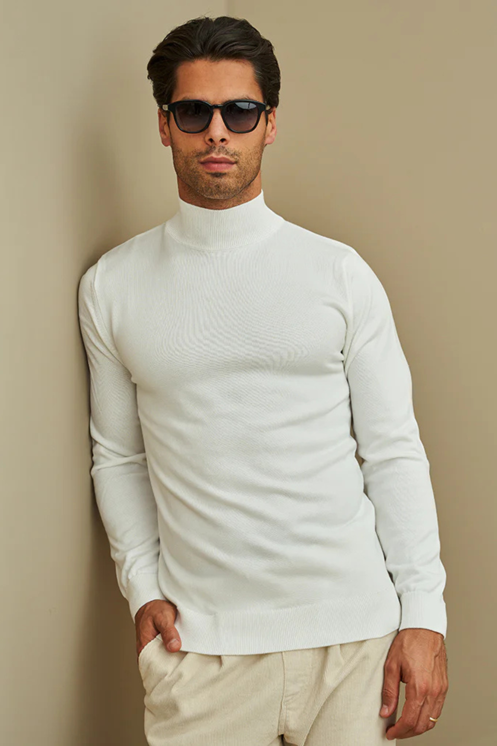 Camisola de meia-gola em malha fina, com um visual clean, sofisticado e intemporal. Uma peça essencial no guarda-roupa masculino, ideal para quem privilegia elegância discreta, conforto e versatilidade no dia a dia.