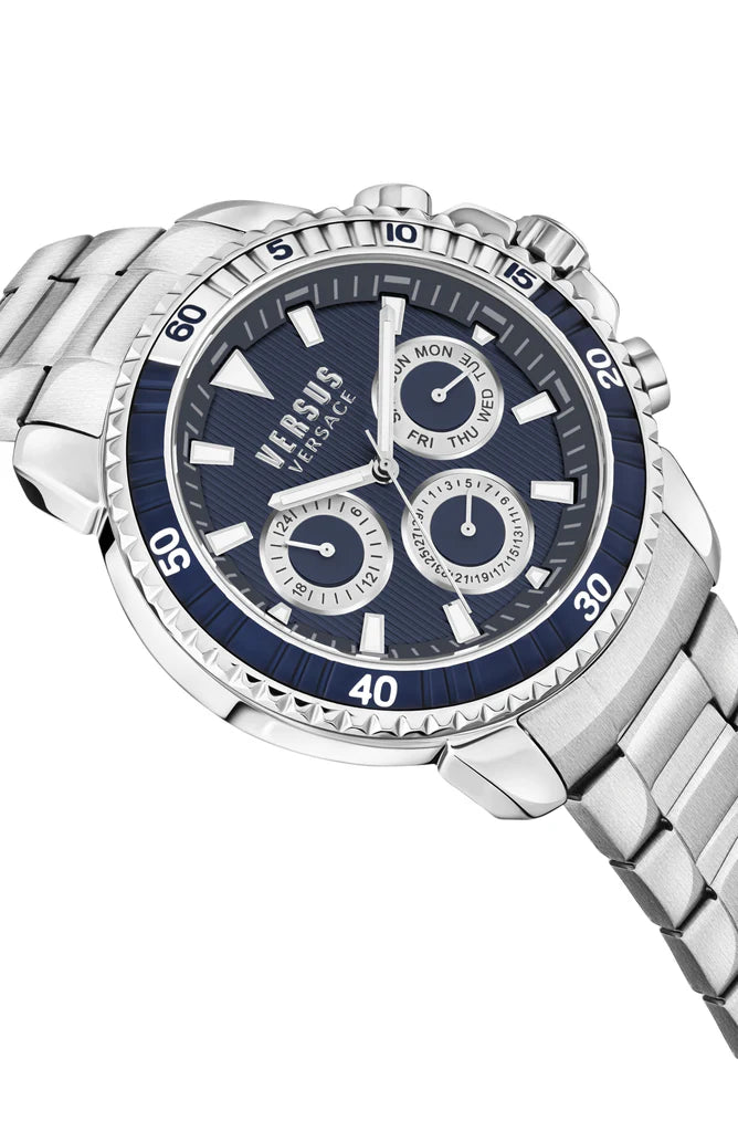 Características adicionais: A coleção Aberdeen é reconhecida pelos seus detalhes texturizados e pela moldura (bezel) trabalhada que confere uma profundidade visual única à peça. O mostrador azul não só proporciona um excelente contraste com os índices prateados, como também reforça a identidade urbana da Versus Versace. É o relógio ideal para o homem que não abdica da precisão e quer elevar o seu visual com um toque de prestígio italiano.