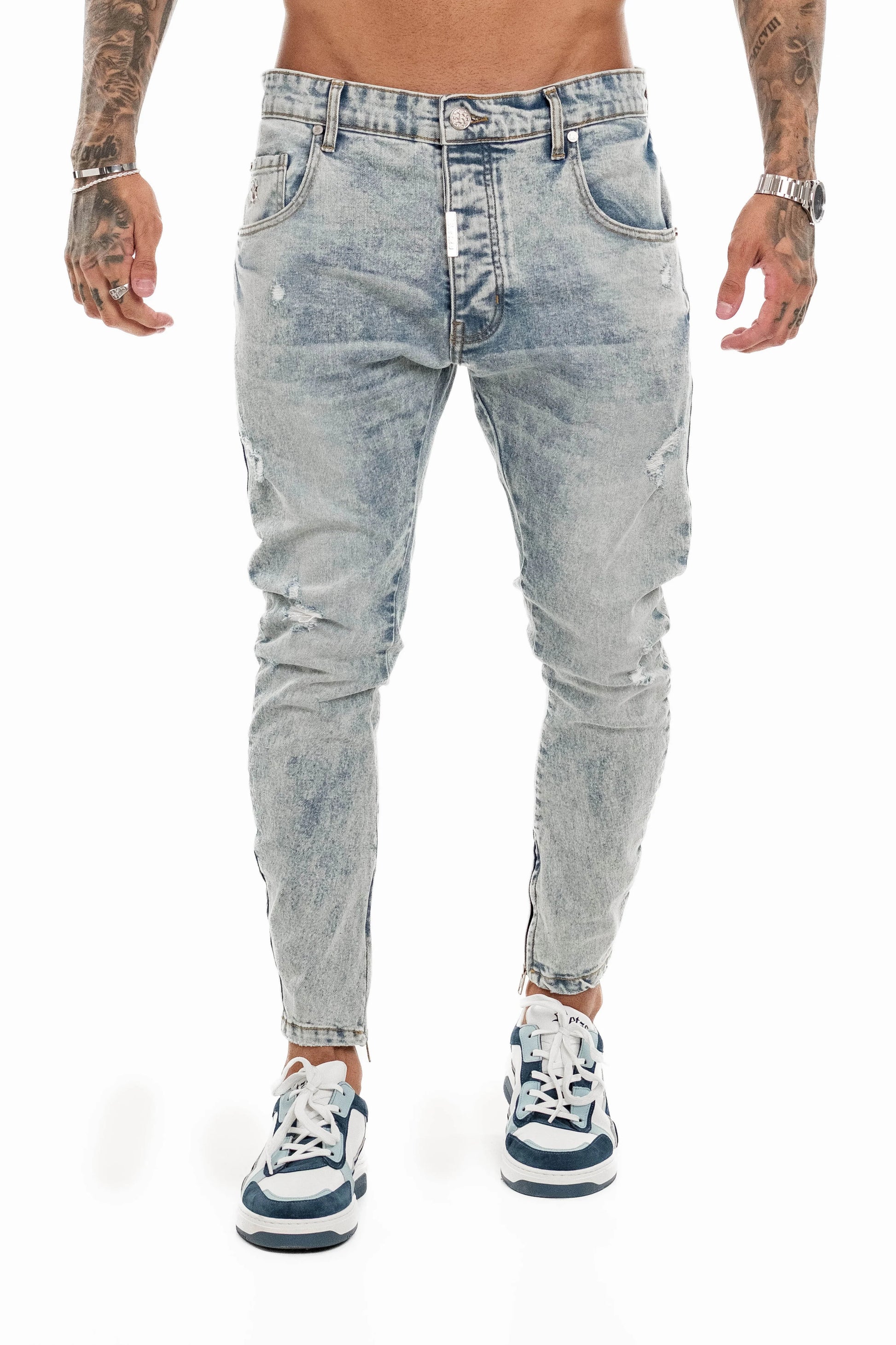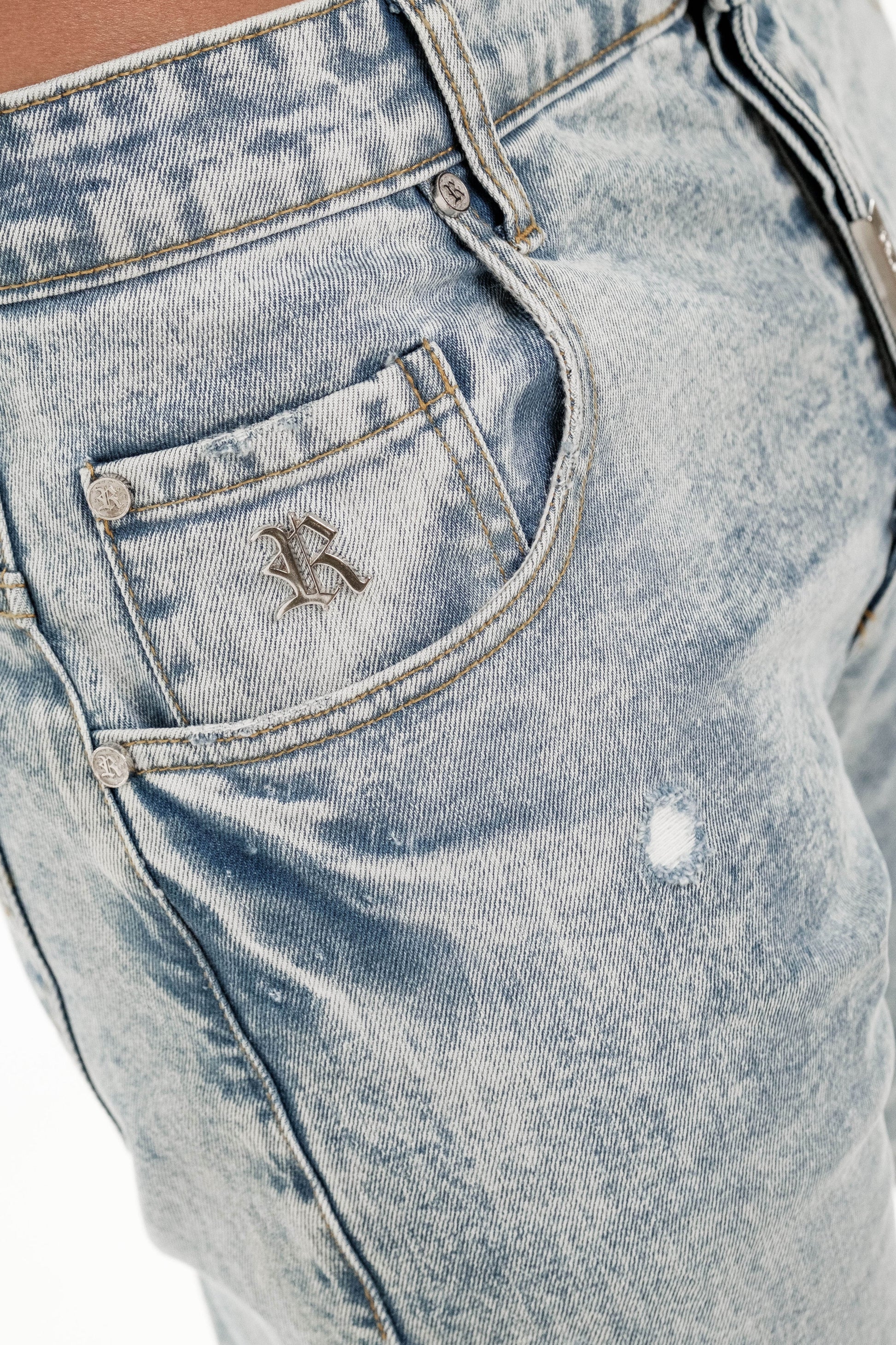 Acabamentos: Lavagem "stone wash", rebites metálicos reforçados, pespontos contrastantes