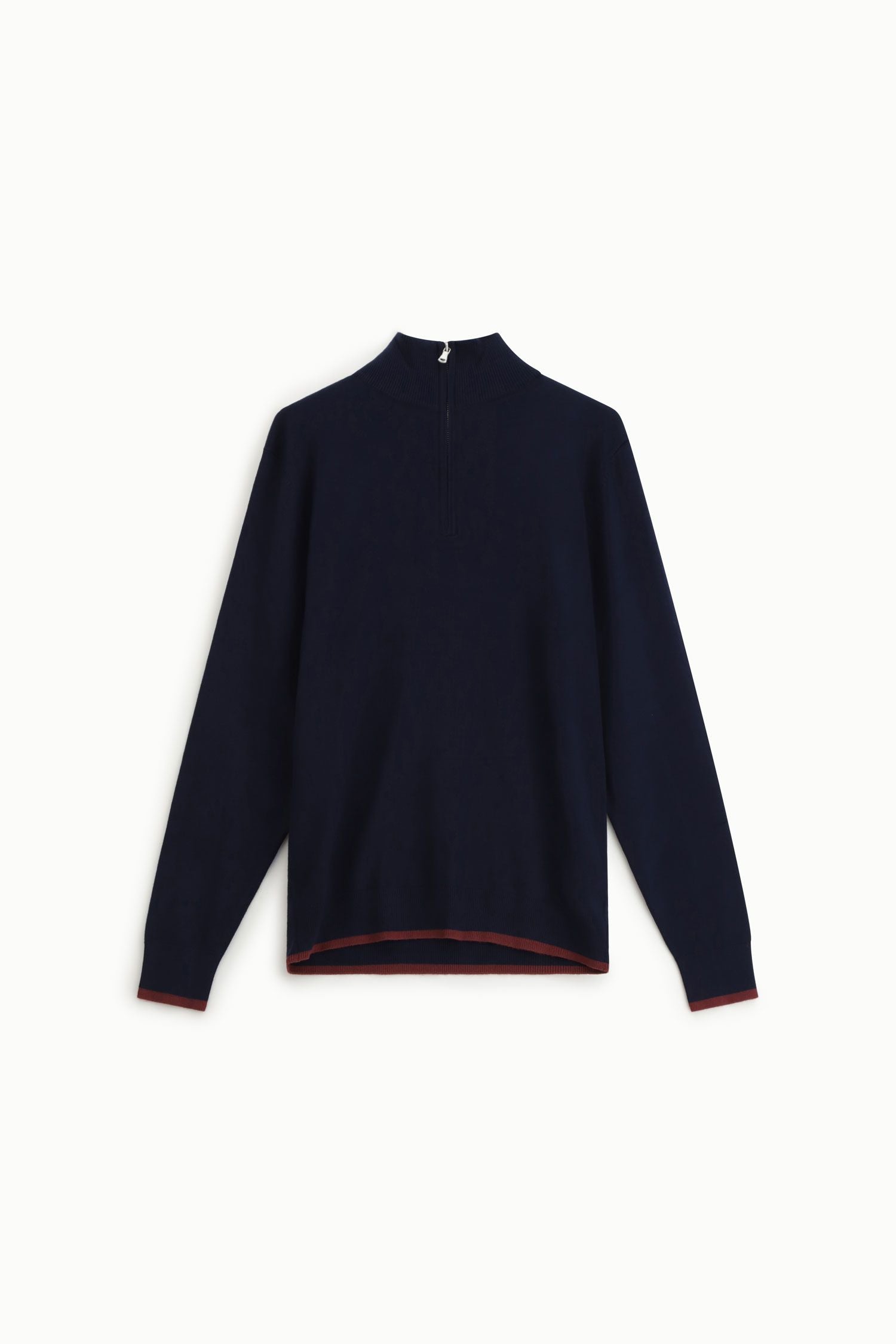 - Gola: Gola alta (polo neck) com fecho de meio-zíper