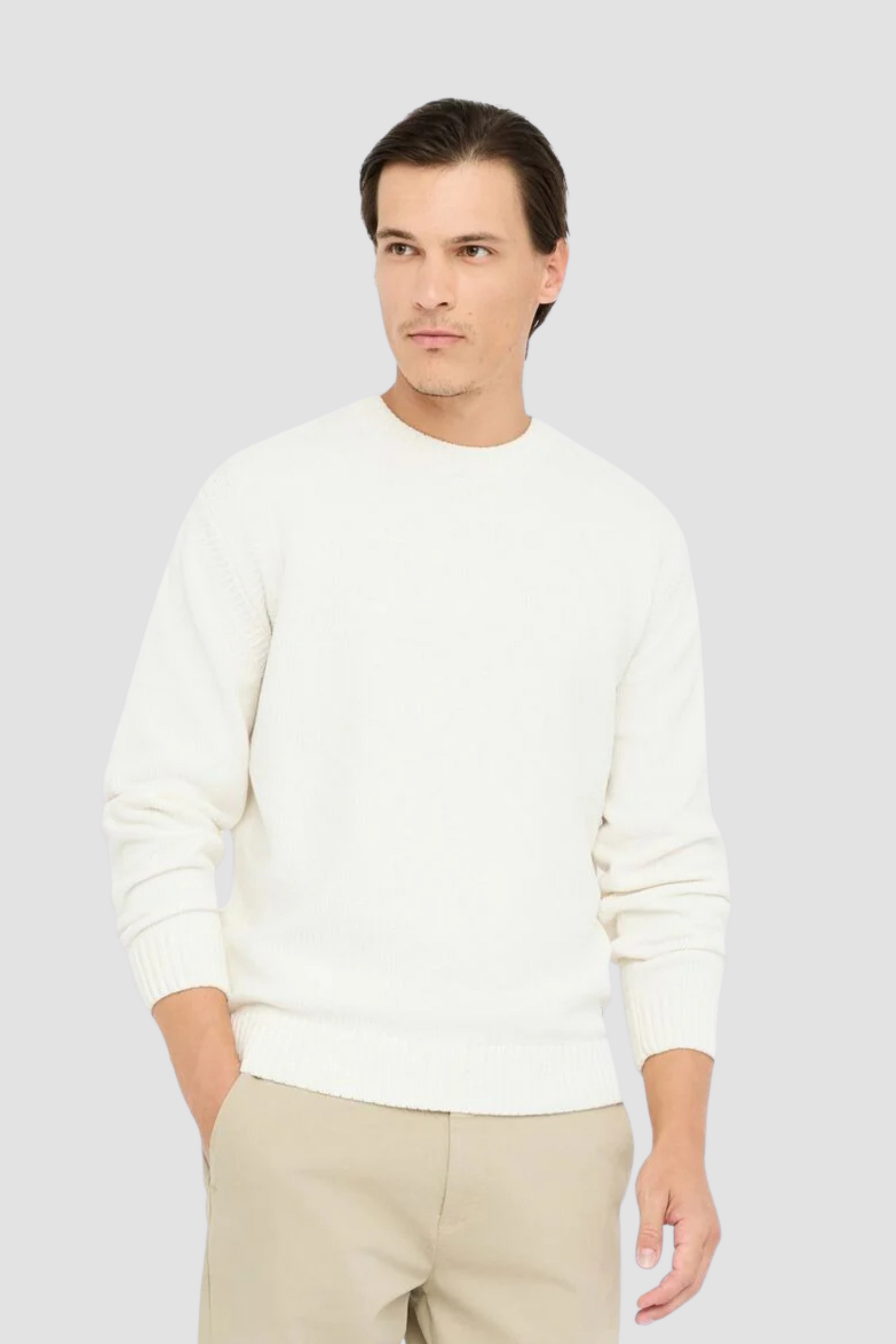 A malha chenille acrescenta textura e estilo sem esforço, enquanto o design limpo com gola redonda e mangas compridas torna-a fácil de integrar em looks urbanos ou casuais. Os acabamentos em canelado reforçam o conforto e a forma da peça.