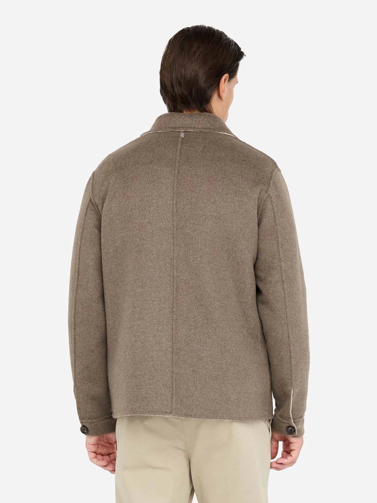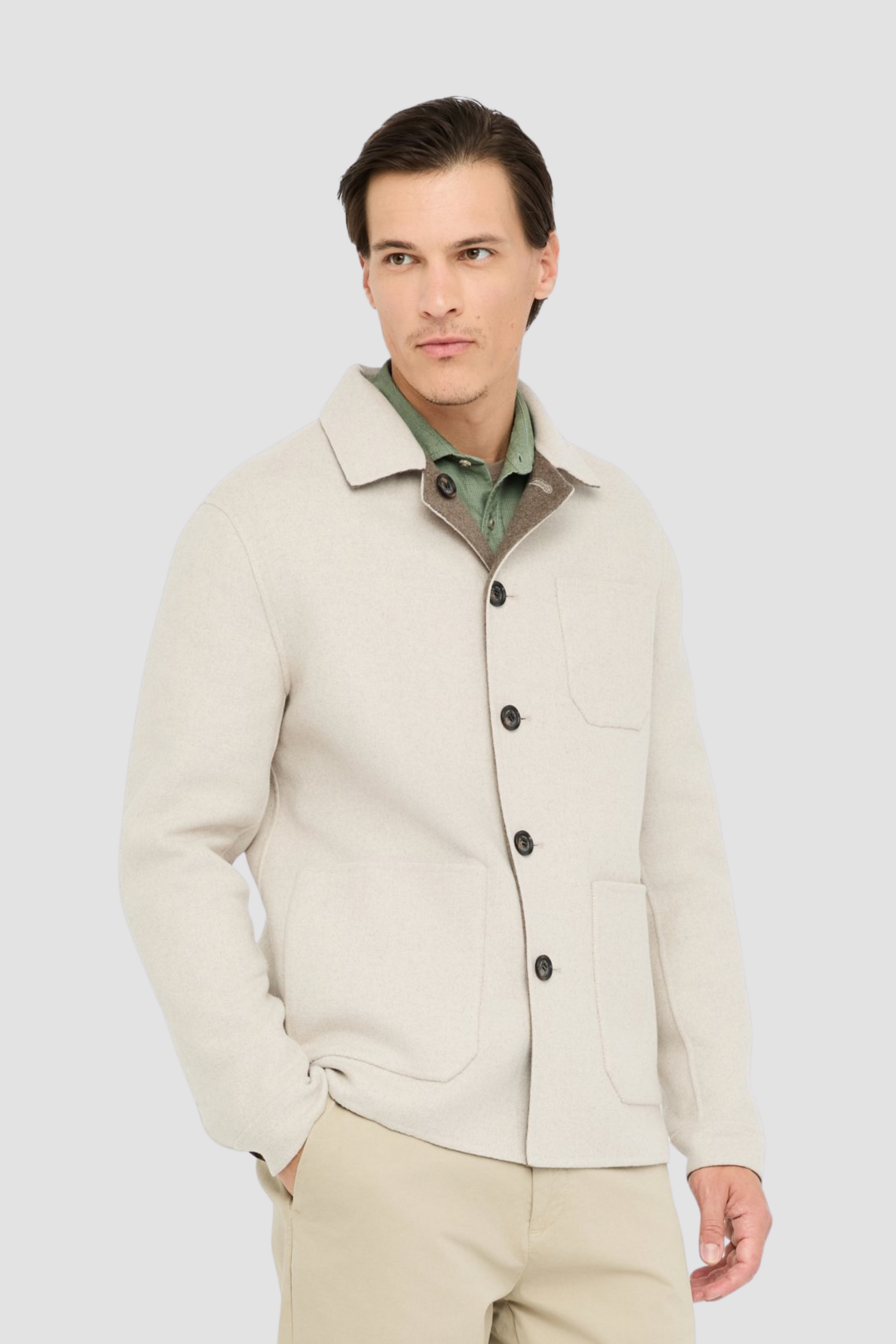 Este casaco reversível alia funcionalidade e sofisticação num design contemporâneo. Confecionado em tecido de mistura de lã (50% lã, 40% poliéster, 10% outras fibras), garante conforto térmico e um toque elegante. O corte regular com gola de camisa e fecho de botões torna-a prática e versátil, enquanto os bolsos funcionais e o logo metálico no peito acrescentam modernidade e identidade à peça. Uma escolha ideal para looks casuais ou urbanos, perfeita para usar em diferentes ocasiões graças ao seu lado reversível.