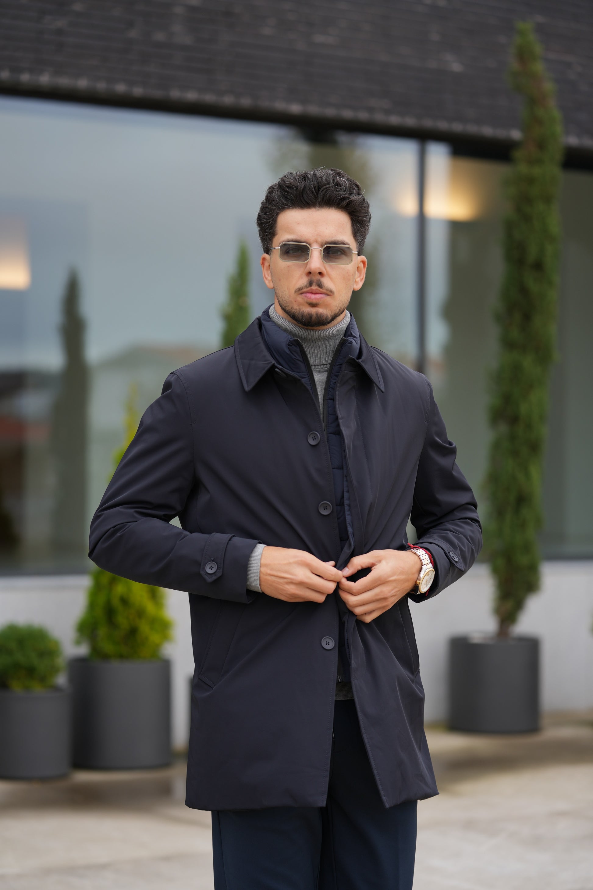 – Detalhes de alfaiataria com gola clássica, botões frontais ocultos e punhos com fecho de botão